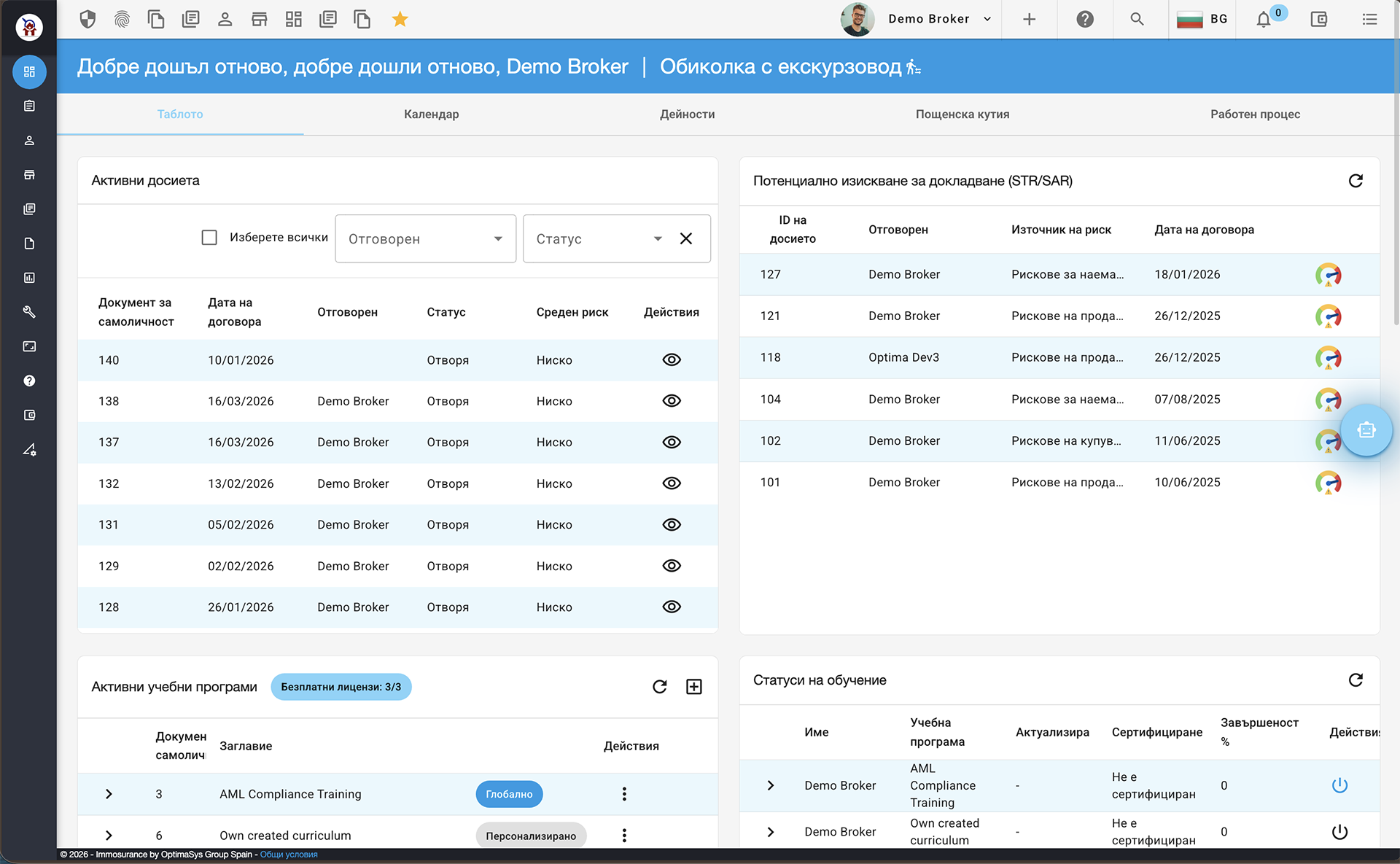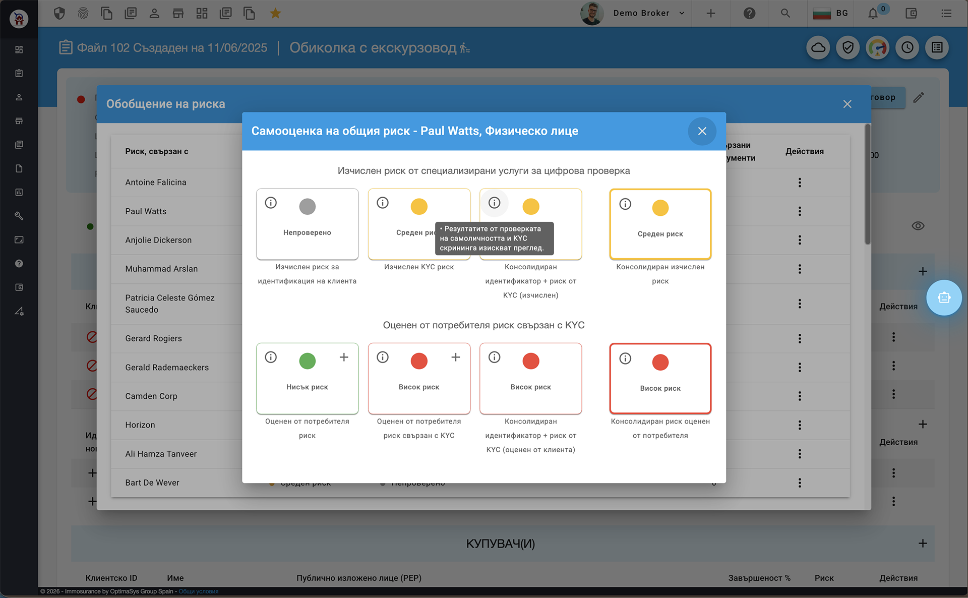 Имайки предвид, че Immosurance предлага специални потребителски роли за одитори, които могат да преглеждат всички съответни детайли за спазването на KYB и KYC, могат да се генерират отчети за всяко досие, както и за всеки от свързаните с него клиенти. Такива отчети се генерират на езика на страната/потребителя, за да служат на одиторите от тези страни и включват всички необходими проучвания & оценка на риска & детайли за тълкуване на риска.